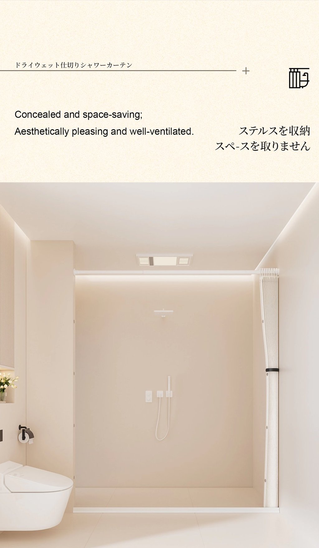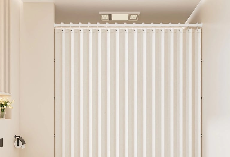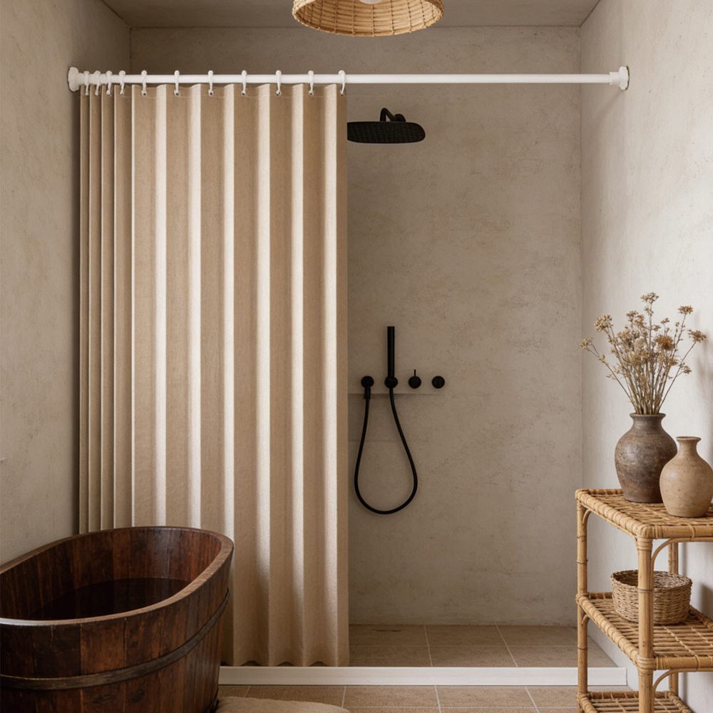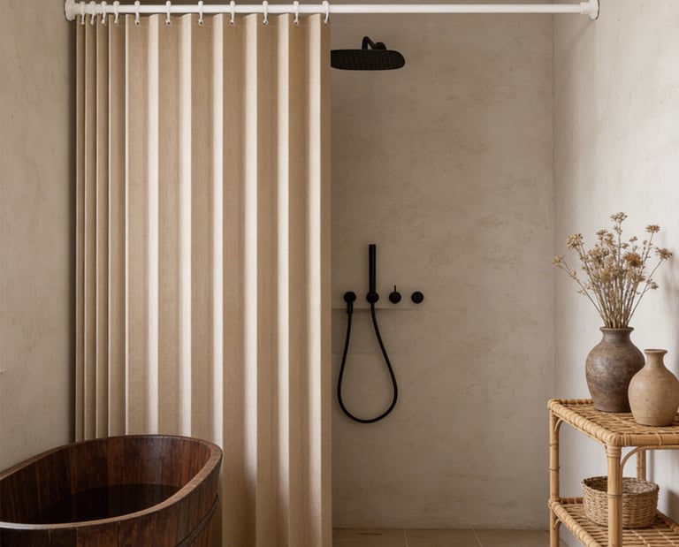 A minimalist shower curtain collection designed specifically for hotels, apartments, serviced apartments, and high-end vacation rentals.