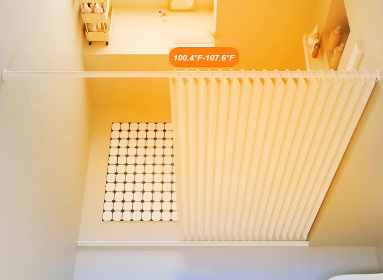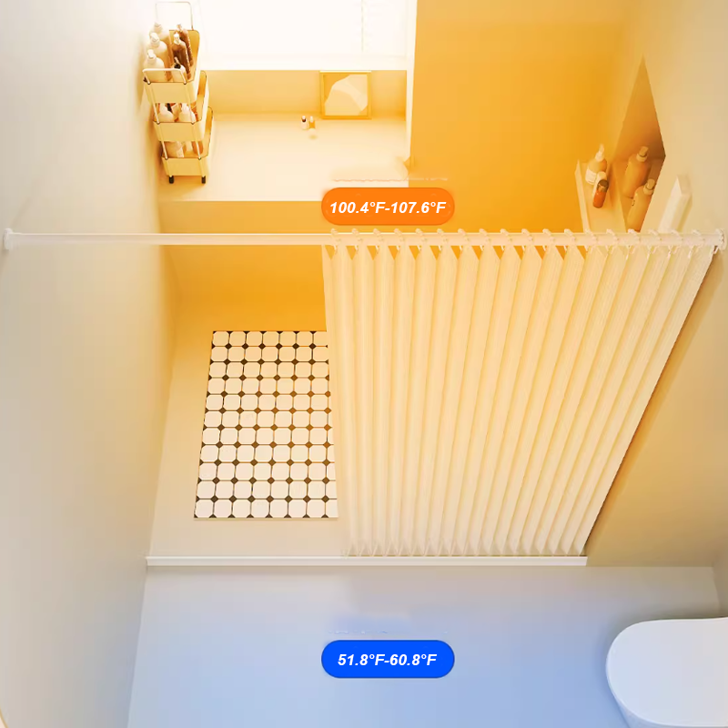Temperature inside the shower curtain 100°F-107.6°F Temperature outside the shower curtain 51.8°F-60.8°F