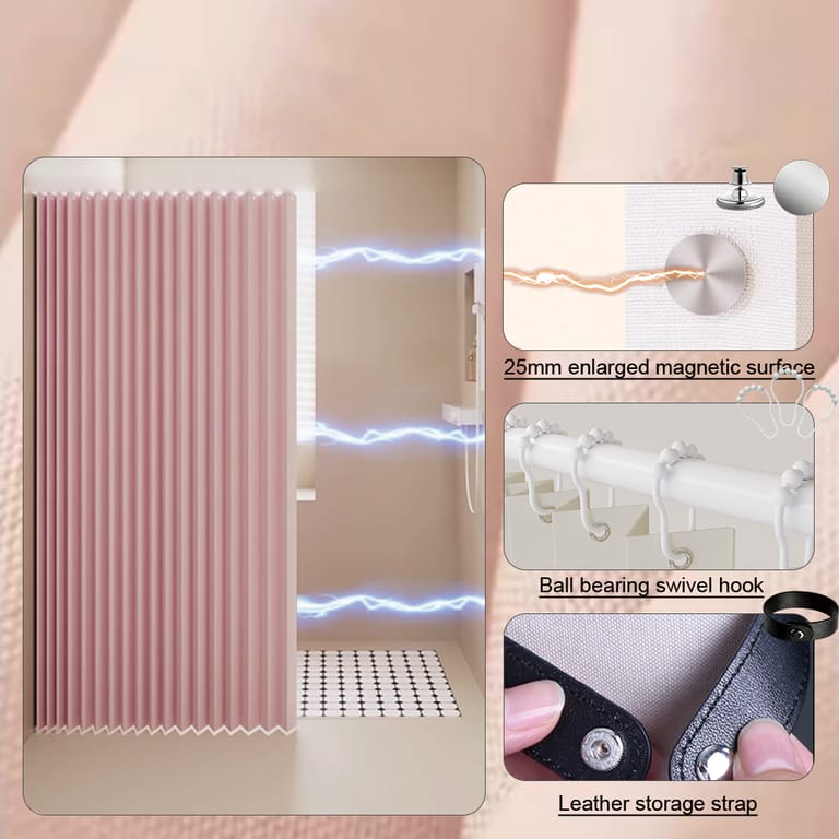 Dual-Side Magnetic Seal Experience the ultimate splash protection. Our innovative design features a dual-side 8-point magnetic suction system. With upgraded 25mm widened magnetic contact surfaces, the curtain snaps tight to the walls, ensuring a 100% water-tight seal. No more floor puddles after your shower.
