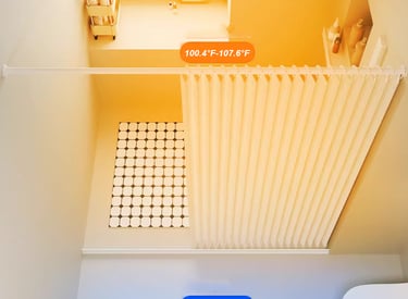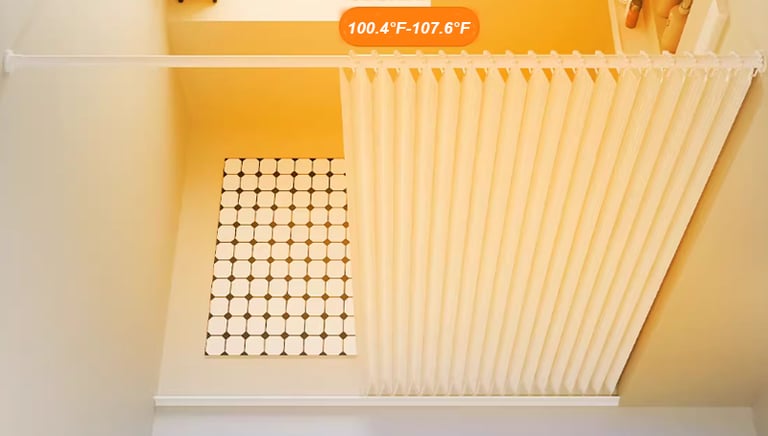 Temperature inside the shower curtain 100°F-107.6°F Temperature outside the shower curtain 51.8°F-60.8°F